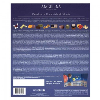 Pařížský dům Angelina představuje adventní kalendář plný 24 kouzelných překvapení. Okénka ukrývají čokoládové pralinky, hebké karamelové kopule, křupavé palačinky, ovocné pasty a nugát z Montélimar. Tato bohatá kolekce snoubí tradici s kreativitou a mísí textury od křupavých po vláčné. Vychutnejte si tuto jedinečnou čokoládovou cestu plnou elegance po celý prosinec. Edice 2025.