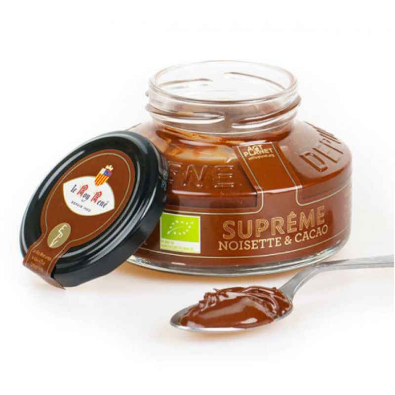 Top-Kombination aus Kakao und Haselnüssen in einer köstlichen BIO-Supreme-Creme.